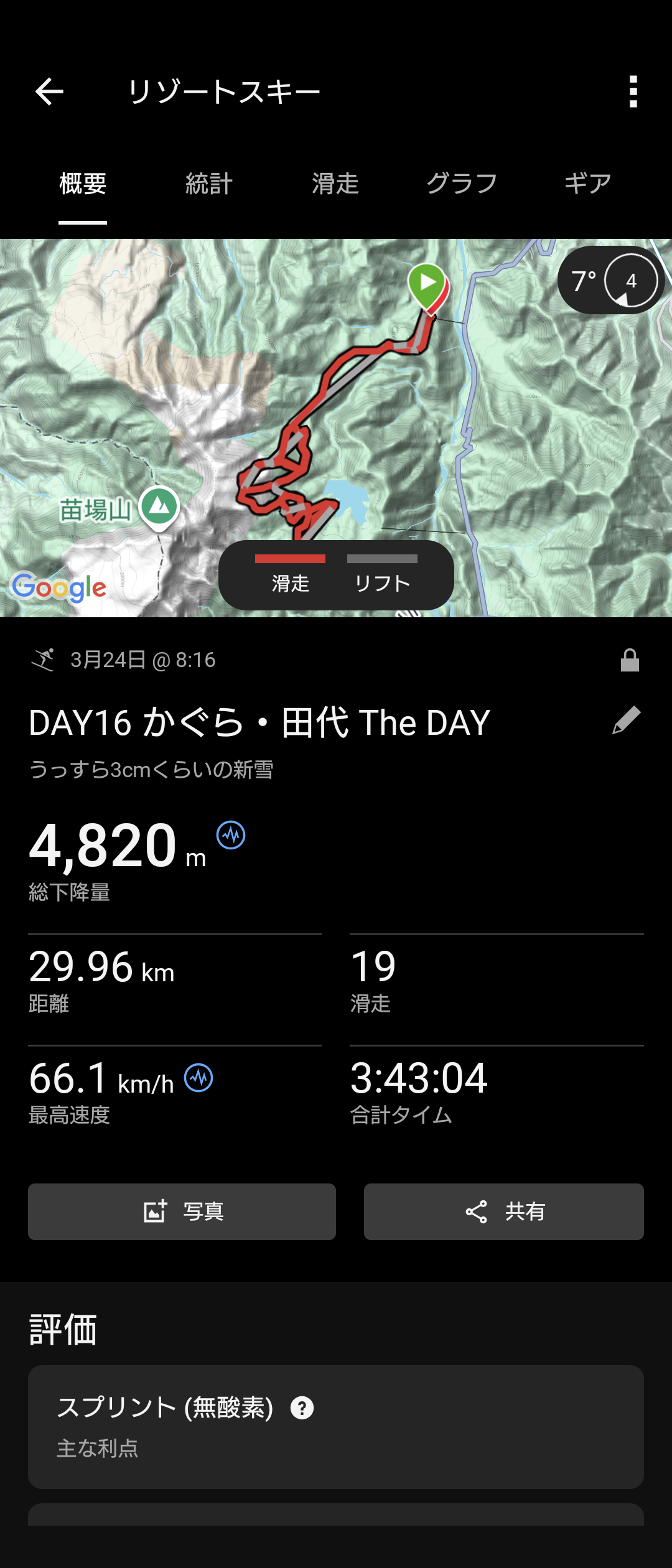 みつまた~かぐら~田代と往復して、獲得標高4,886mと結構滑りました。