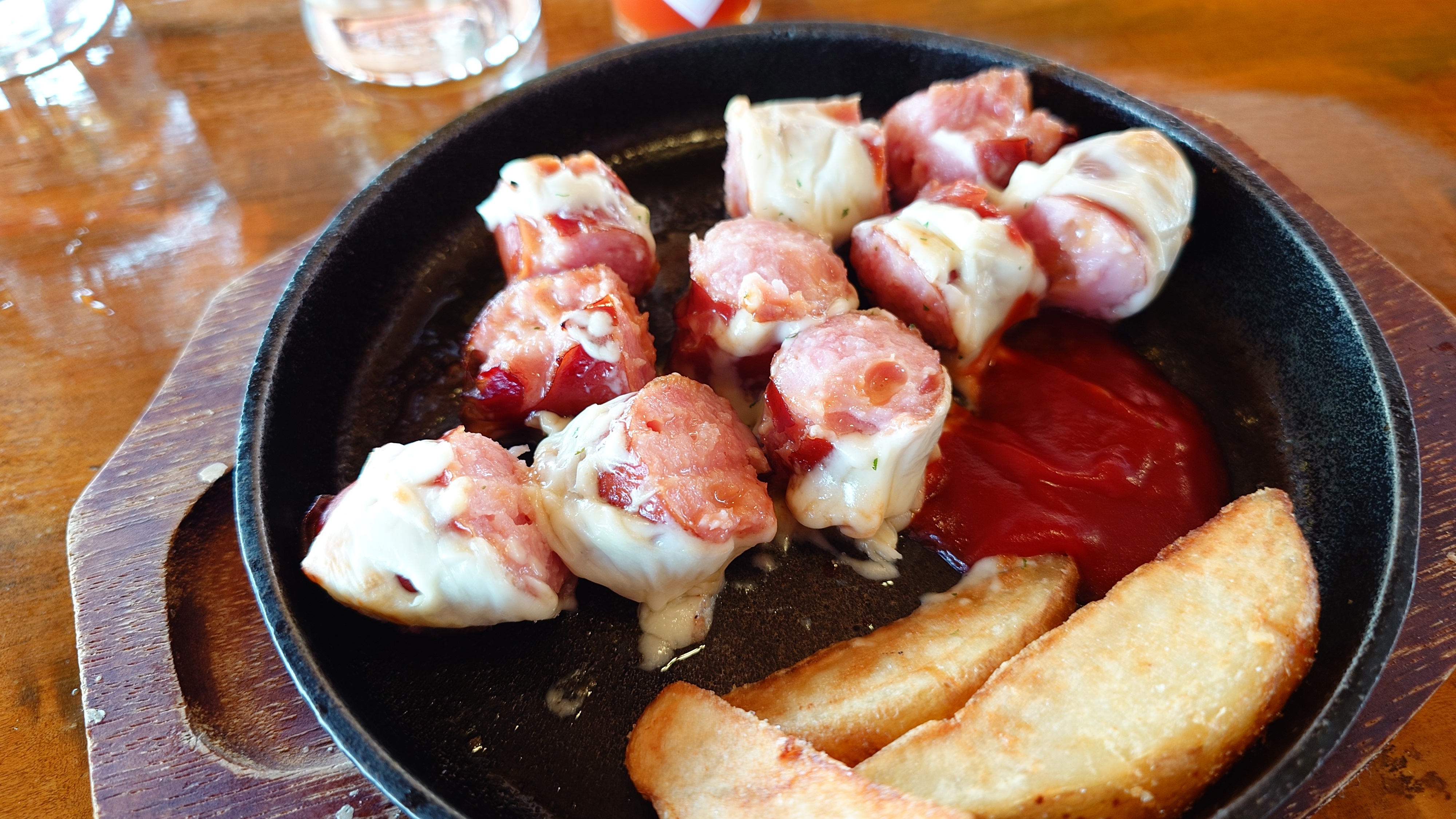 テラスでもいいのですが、冷めるのが早くなるので、大窓から眺めつつ、ダブルチーズソーセージとビール。潤います。