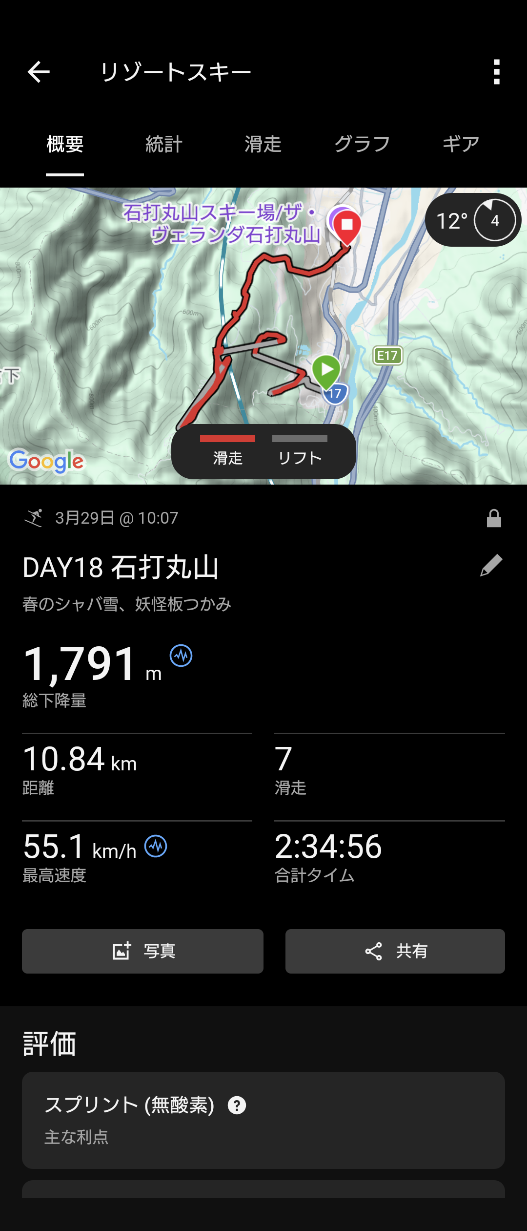 10時8分にハツカ石のゲートを抜けたので、1時間は1,500円滑り放題。10時間で15千円の湯沢7券が9時間も残ってたので今日は石打なのですが、1時間で結構滑れます。リフト待ちが長いとそうも行かないのですが、春で空いてます。