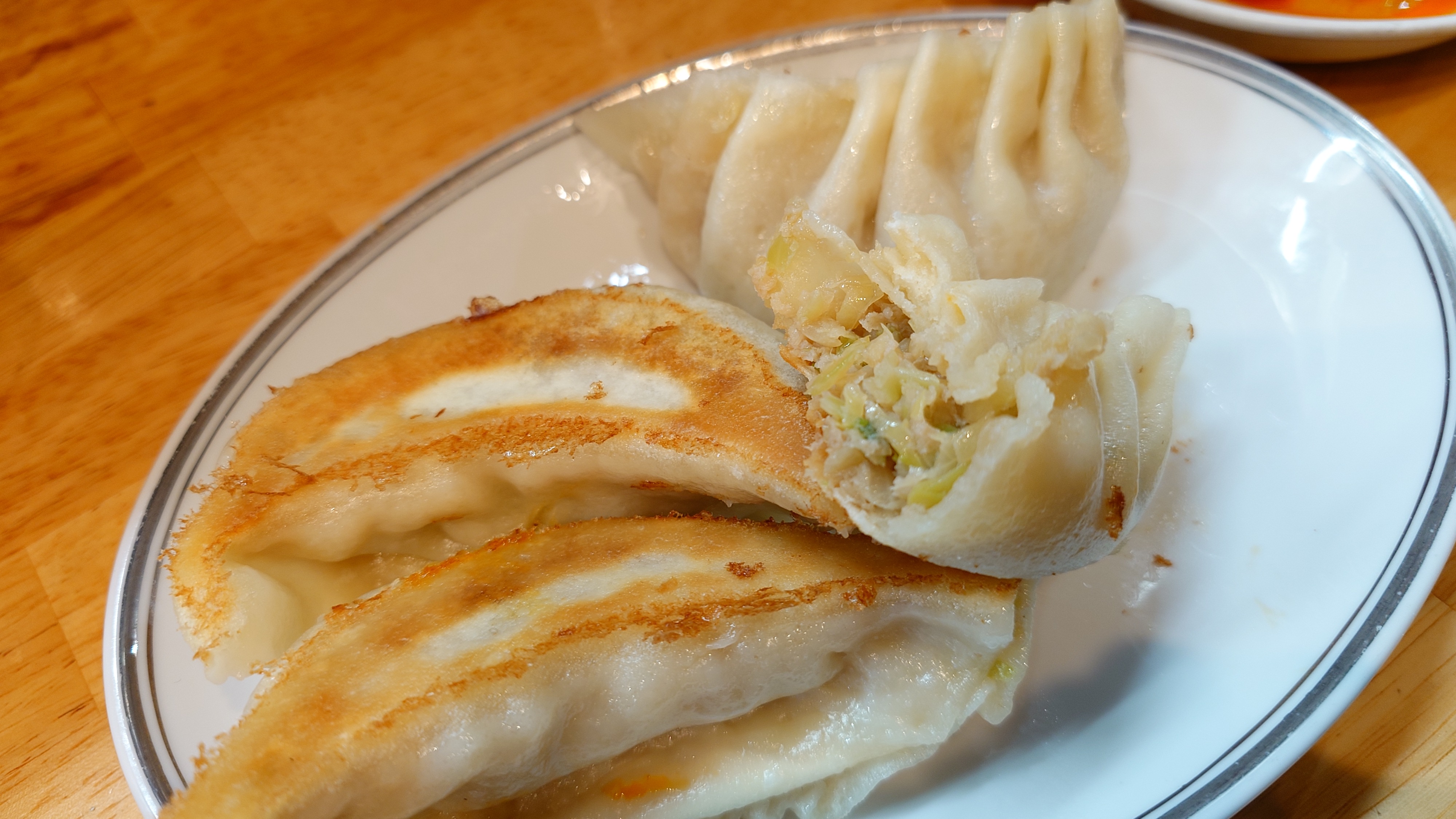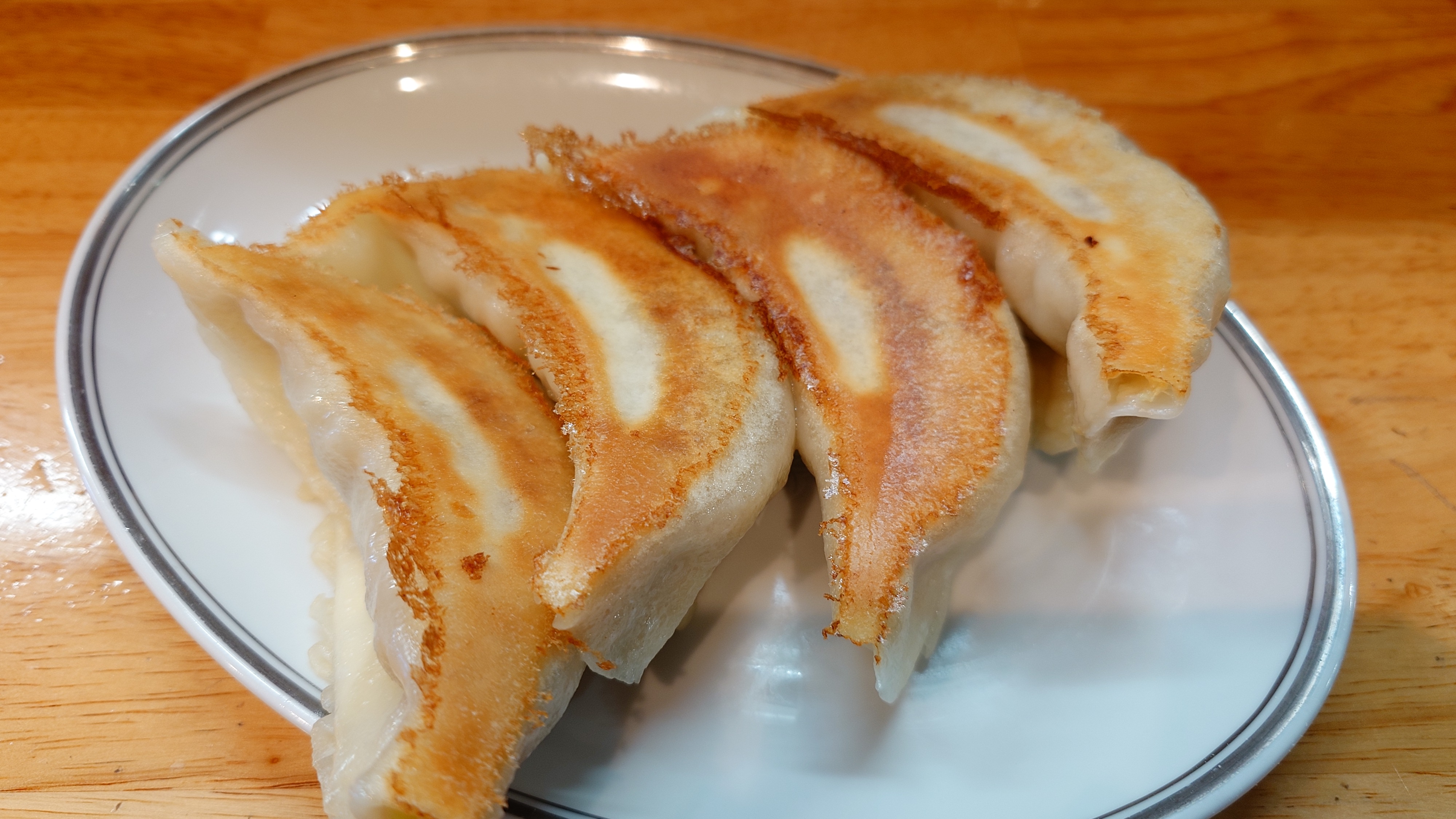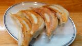 名物の大きな餃子にカレーチャーハンの辛口。欲張って餃子1人前の4個にしたら、チャーハンとで超満腹。