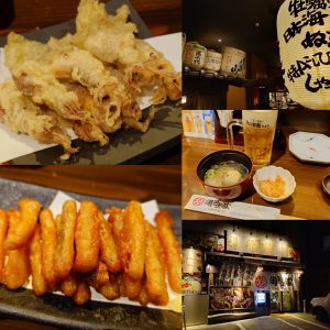 夜、やっと外に出て湯沢釜蔵へ。蛍烏賊の天ぷらとゴボウの唐揚げでビールです。
