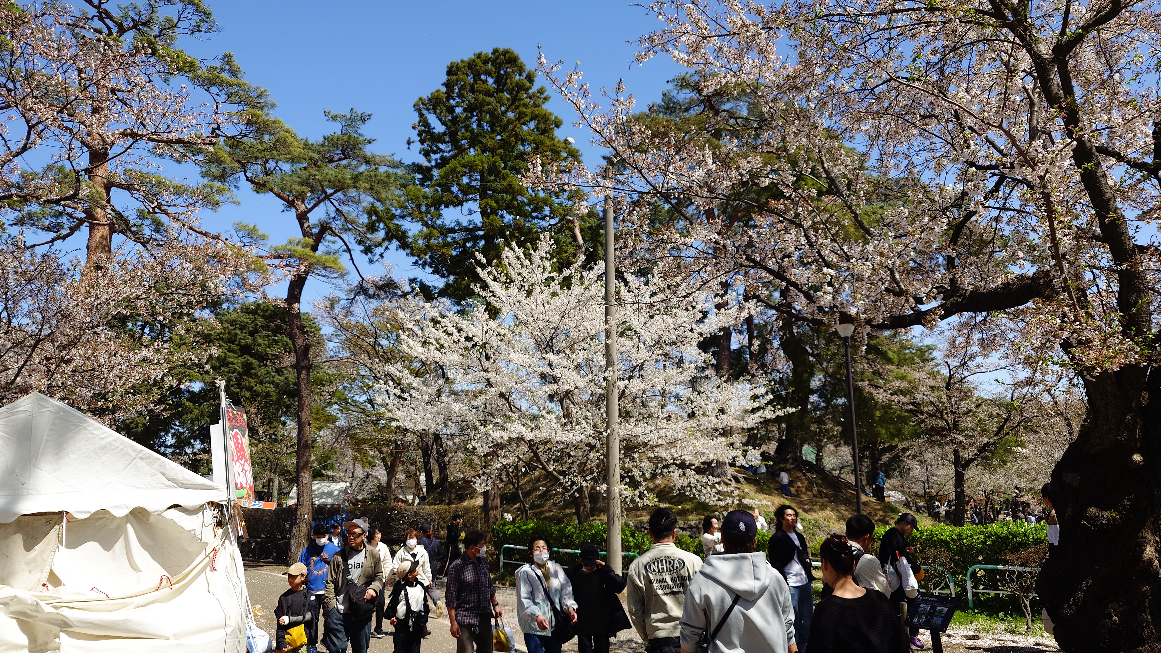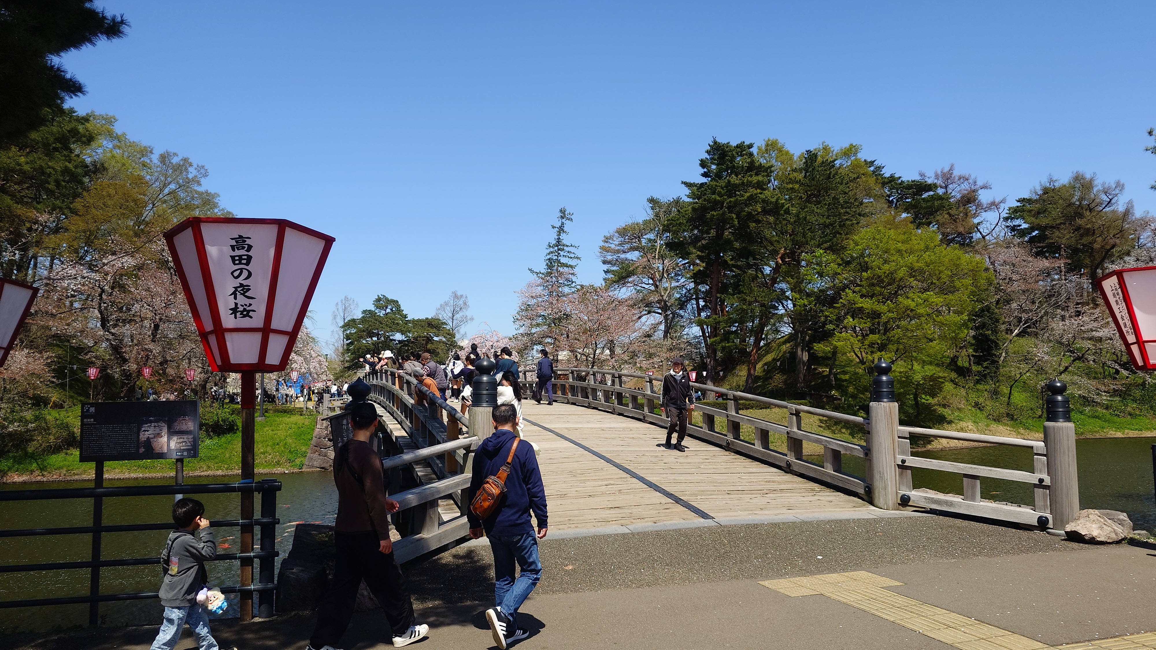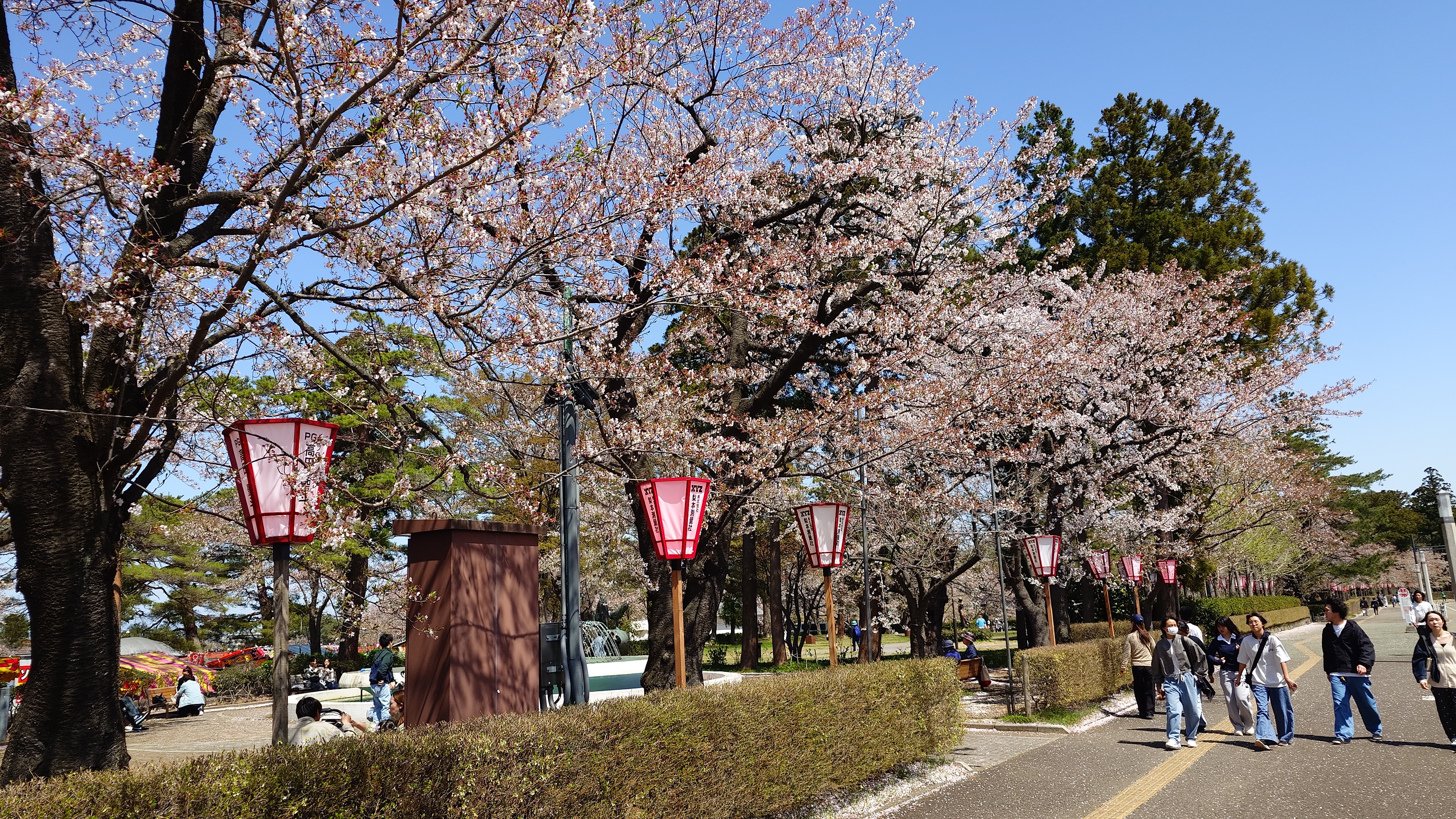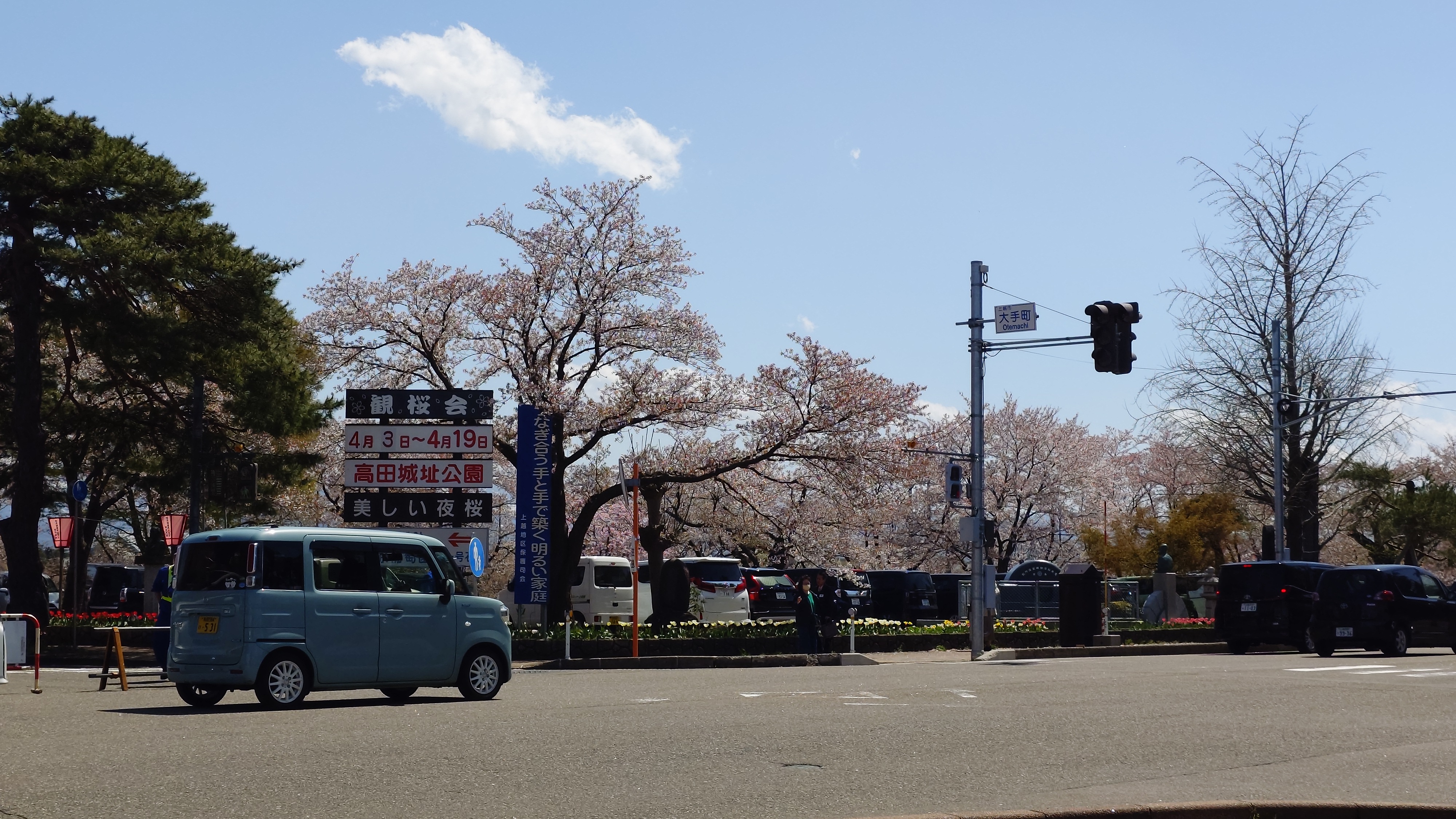 高田城址のお堀端まで来ると、意外に満開です。強風で葉桜かなと思っていましたが、明日も大丈夫そう。