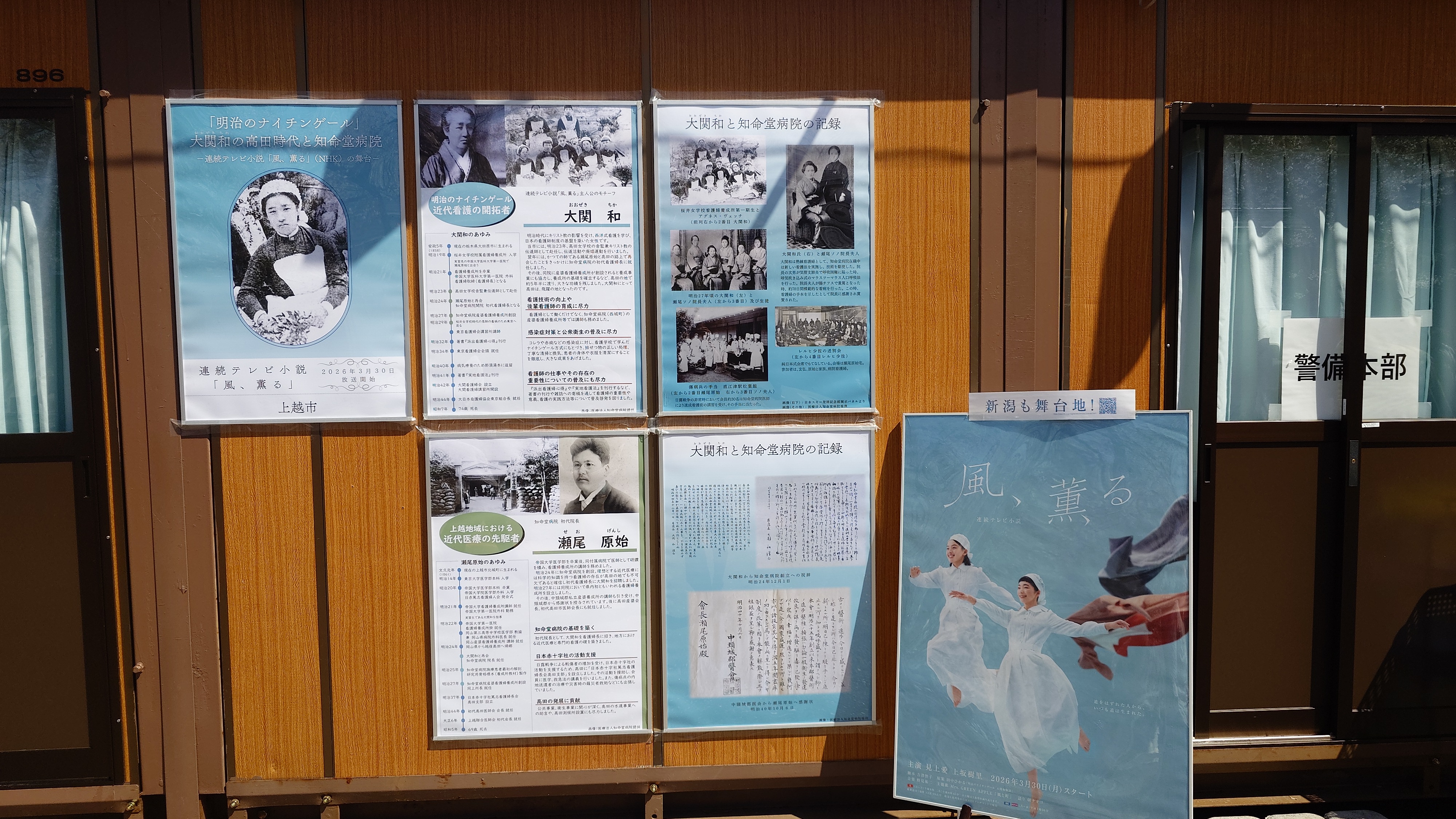 観桜会本部の裏には、明治のナイチンゲール、NHK朝ドラ「風、薫る」の舞台になることのパネルなど。中盤で高田に赴任するようです。