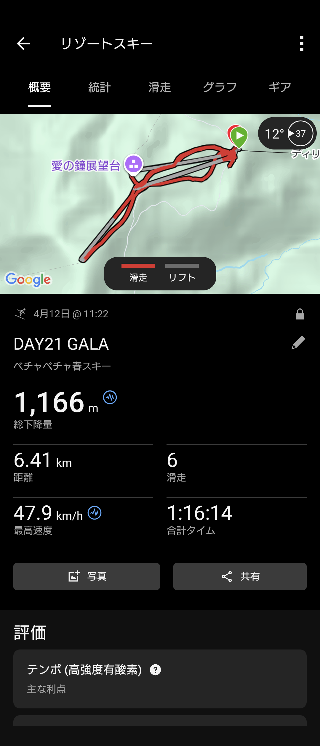 滑走量も少なく、獲得標高1,166m。滑走6本どまりです。