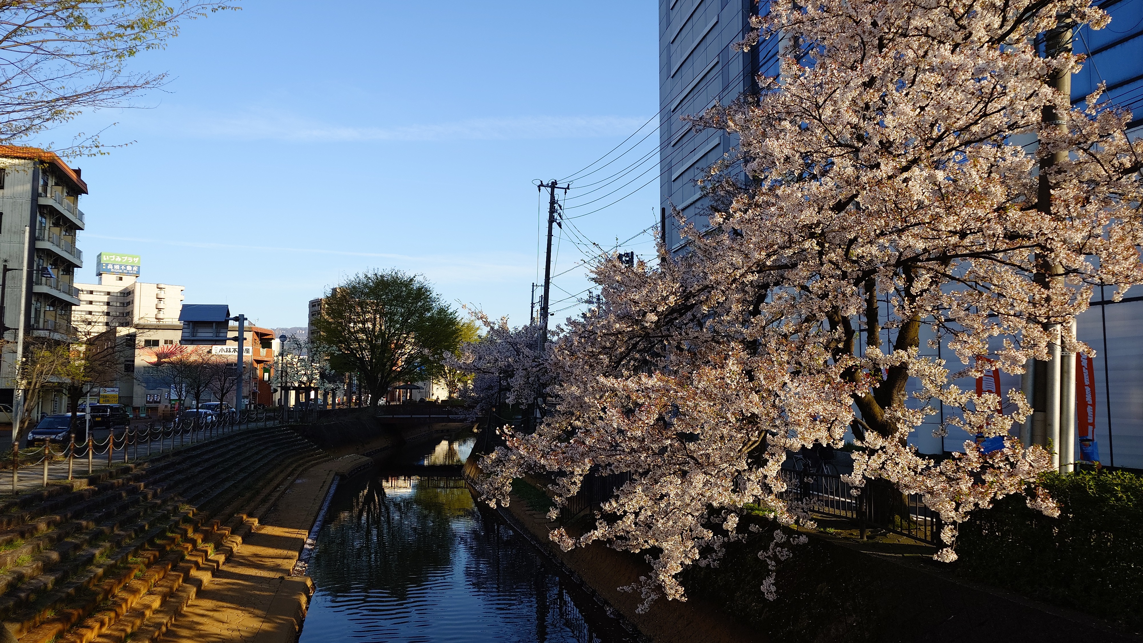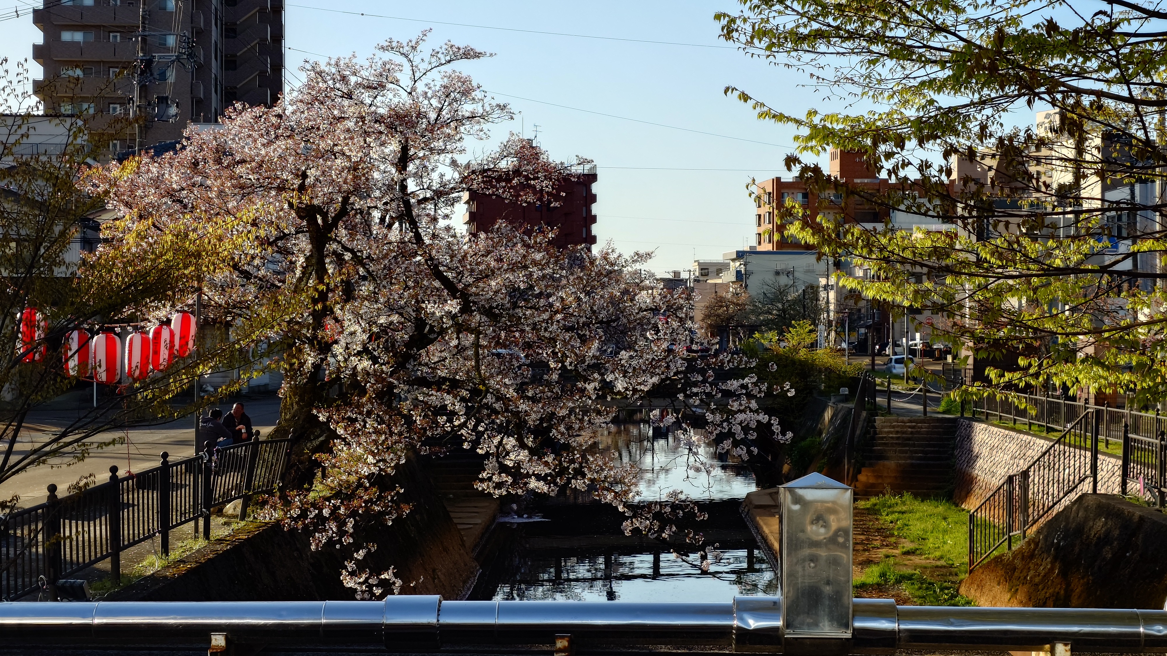 近くの柿川沿いの桜並木も散り始め。電車の時間まで暇つぶし。