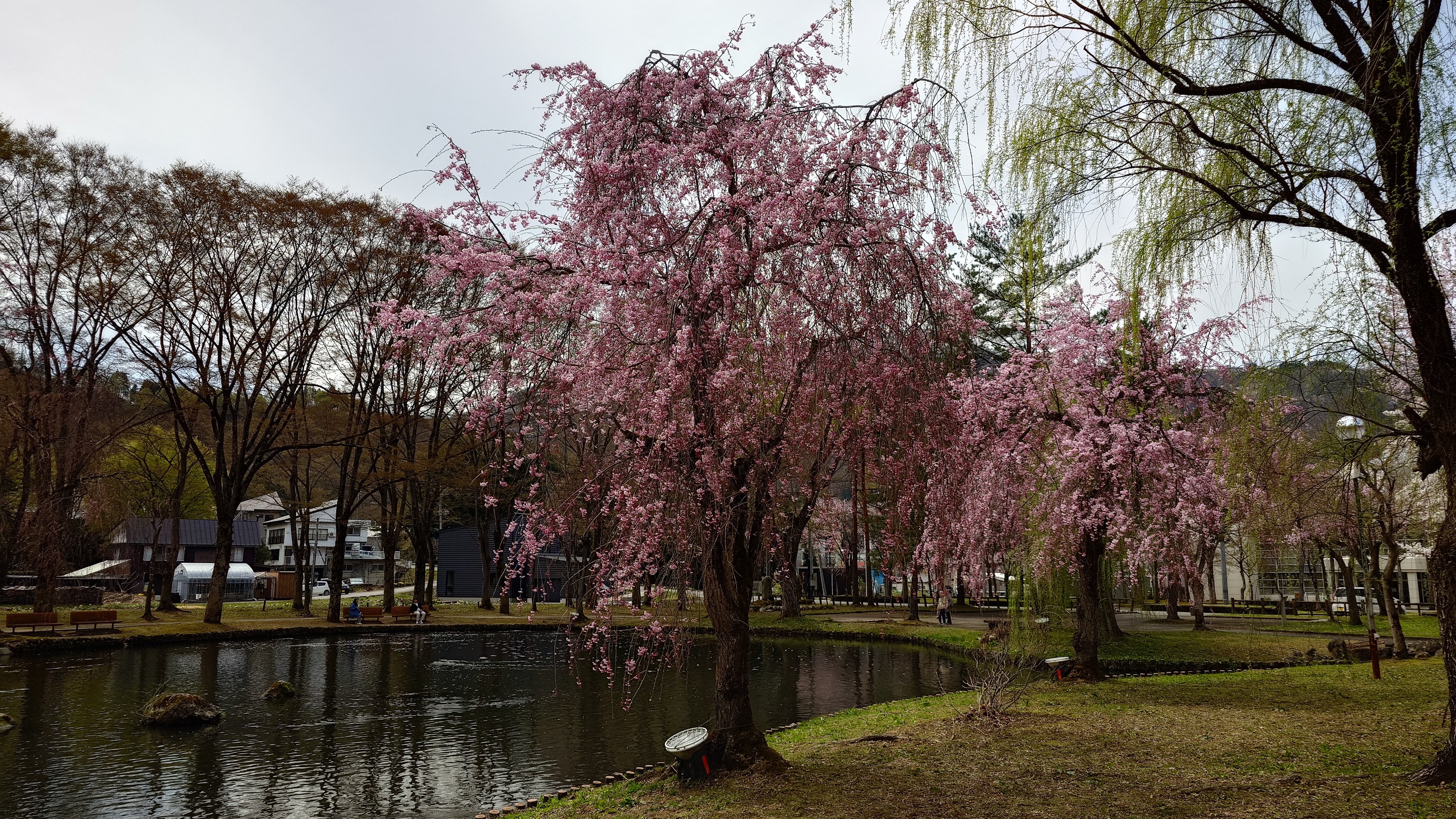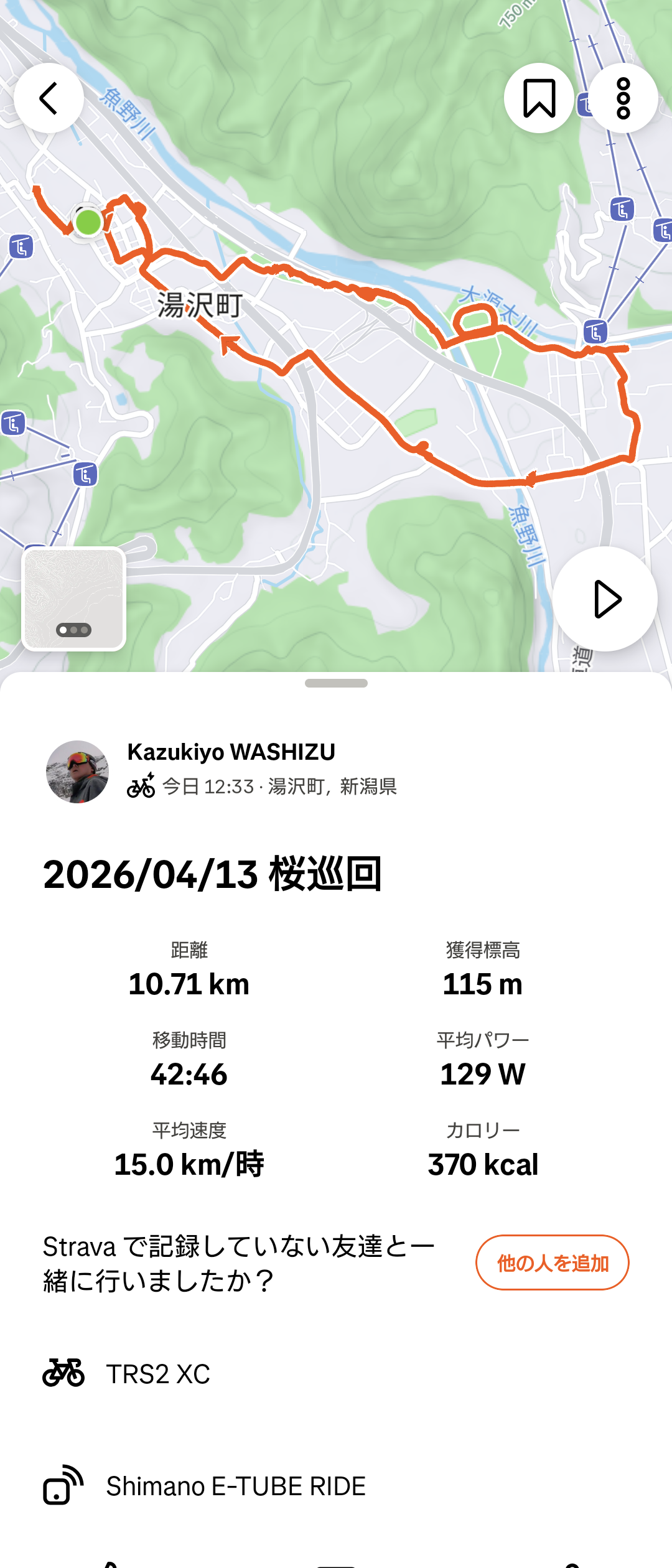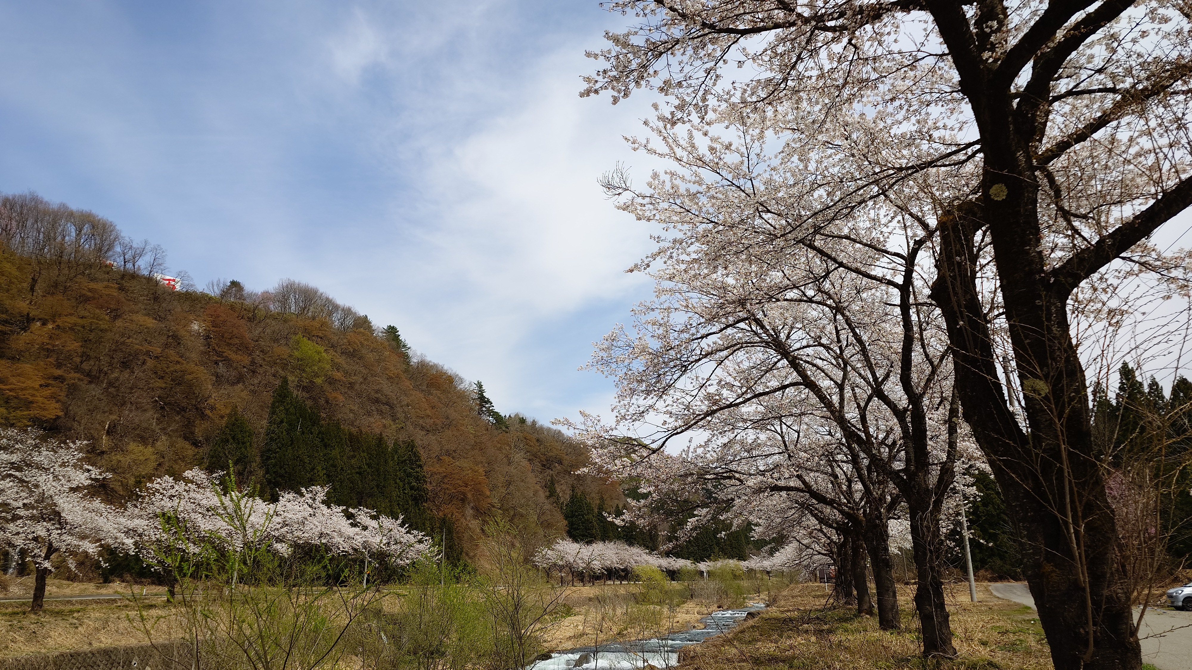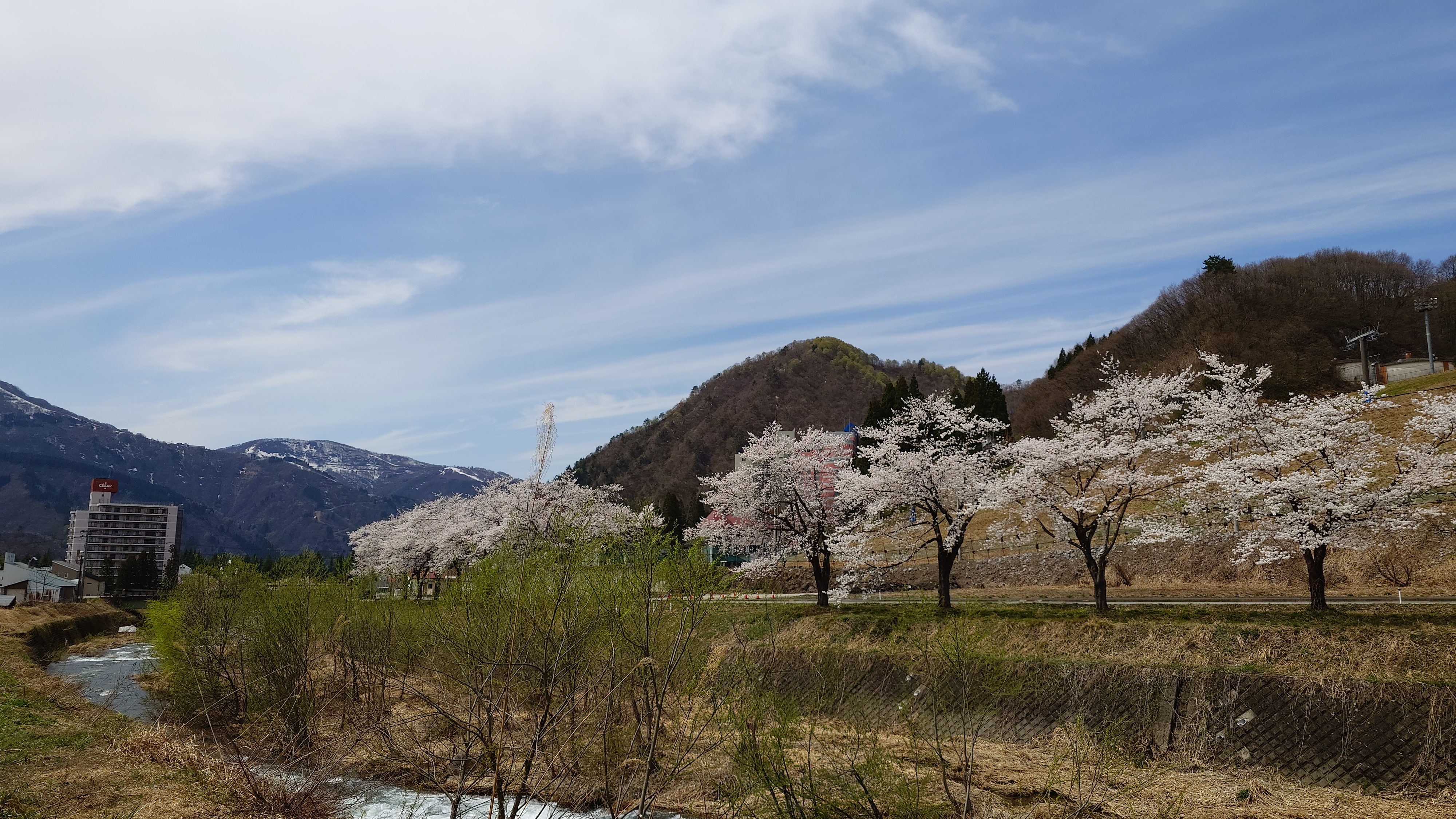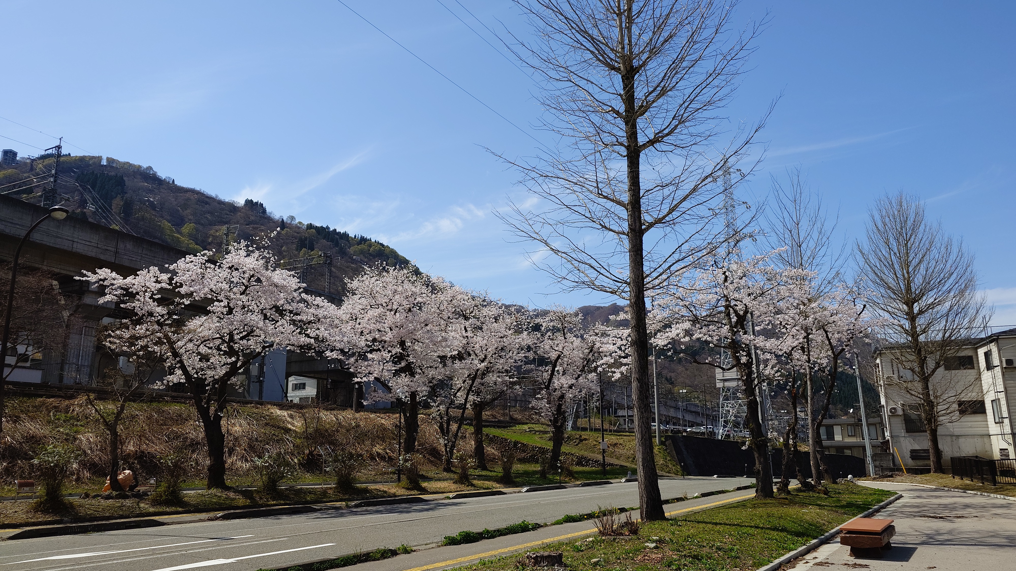 お昼休みにくるっと桜の見回り 公開済み 2026年4月13日 · 更新済み 2026年4月14日 2026/4/13(月) お昼休みにくるっと桜の見回り。 カルチャーセンター前の池端は、枝垂桜が多いので5分咲き。ソメイヨシノはほぼ満開。 中央公園のテニスコートだと7分咲きくらいしょうか。 湯沢中央公園の陸上競技場辺りへ。そこから岩原橋。 満開まであとひと息です。 町役場近くから主水公園はほぼ満開。まちなかは暖かいので桜も早めに咲きます。天気も良くて日向ぼっこしてる時間があればよいのですが。 昼休みにくるっと回るのってこれが限界。10Km
