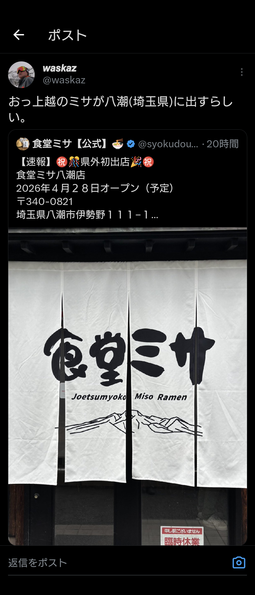 おっ、上越のミサが八潮(埼玉県)に出すらしい。 公開済み 2026年4月16日 · 更新済み 2026年4月17日 おっ、上越のミサが八潮(埼玉県)に出すらしい。via Instagram https://instagr.am/p/DXLr17dk3vH/